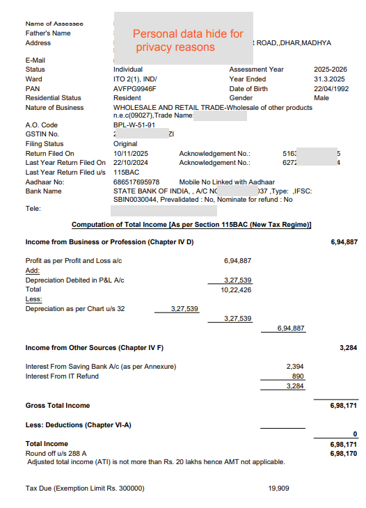 Wholesale trading business ke liye New Tax Regime ke under ITR file kiya. Total income ka proper computation prepare kiya, depreciation schedule optimize kiya as per Income Tax Act, aur Section 115BAC ke provisions apply kiye. TDS aur TCS ko Form 26AS ke sath reconcile karke full credit claim kiya. Section 87A rebate ka benefit apply karke zero tax liability achieve ki, jiske result me client ko refund mila. Poora return accurate, timely aur penalty-free compliance ke sath file kiya gaya.